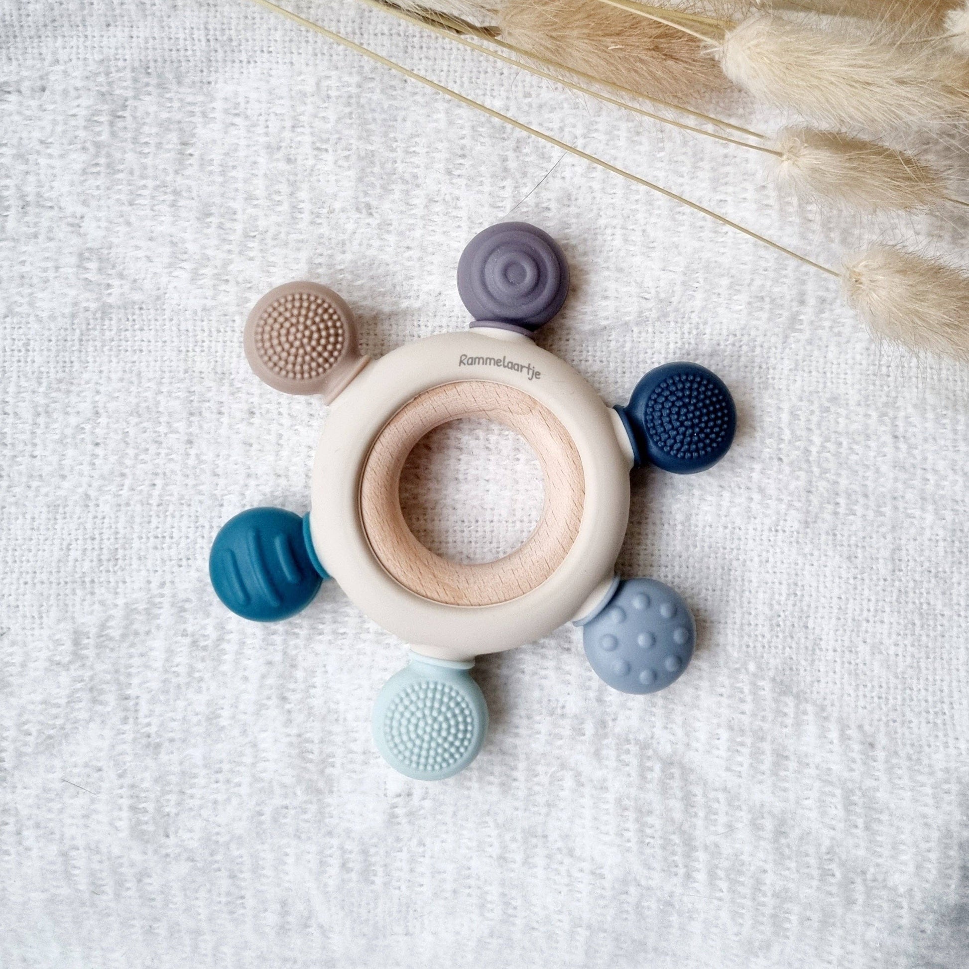 Deze stevige bijtring is echt een must-have! Het is gemaakt van een beukenhouten ring en 100% babyveilige siliconen. Hierdoor is het flexibel, makkelijk vast te pakken en erg fijn om op te bijten. Door het reliëf blijft het interessant en wordt het tandvlees gemasseerd. Wanneer er tandjes doorkomen kan je kleintje hier flink last van hebben. Door het bijten op een siliconen bijtring wordt de druk op het tandvlees verlicht en daarmee neemt ook de pijn af. Deze bijtring heeft een lengte van 10,4cm.